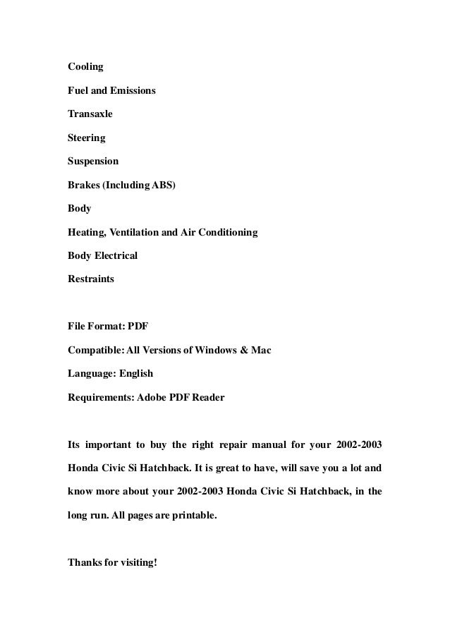 Official Owners Manual for 2003 Honda Civic Sedan from the Honda Owners Site. Maintenance Indicators. These manuals require a valid VIN and mailing address. 2003 Honda Civic Service Manual Pdf – Among a huge number of people today who get 2003 Honda Civic Service Manual Pdf following purchasing a Honda car, only few of them desire to commit hrs digging information in the book. This can be quite common within the society mainly because manual book is regarded as complementary bundle, practically. 2003 Civic Coupe Owner's Manual (2-door) 2003 Civic GX Owner's Manual Supplement 2003 Civic Sedan Owner's Manual. To purchase printed manuals, you can order online or contact: Helm Incorporated (800) 782-4356 M-F 8AM – 6PM EST. Delivery time is approximately five weeks. To save paper and time, you can download the latest manuals now. 2003 Honda Civic Owners Manual – Honda Civic is an icon. Honda sells more than 325,000 Civics a year in the U.S., making it one particular of America’s greatest-selling compacts. They are noteworthy for providing outstanding gas economy and sporty coping with. How to fix the seventh generation of Honda's compact car. 2001, 2002, 2003, 2004, 2005 Honda Civic troubleshooting, repair, and service manuals.